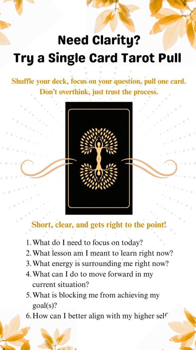 Another great option is the one-card pull. While simple, it encourages you to develop intuition and build a daily connection with your deck. It’s perfect for quick guidance or reflection on daily life happenings. It will also strengthen your knowledge about each card.
