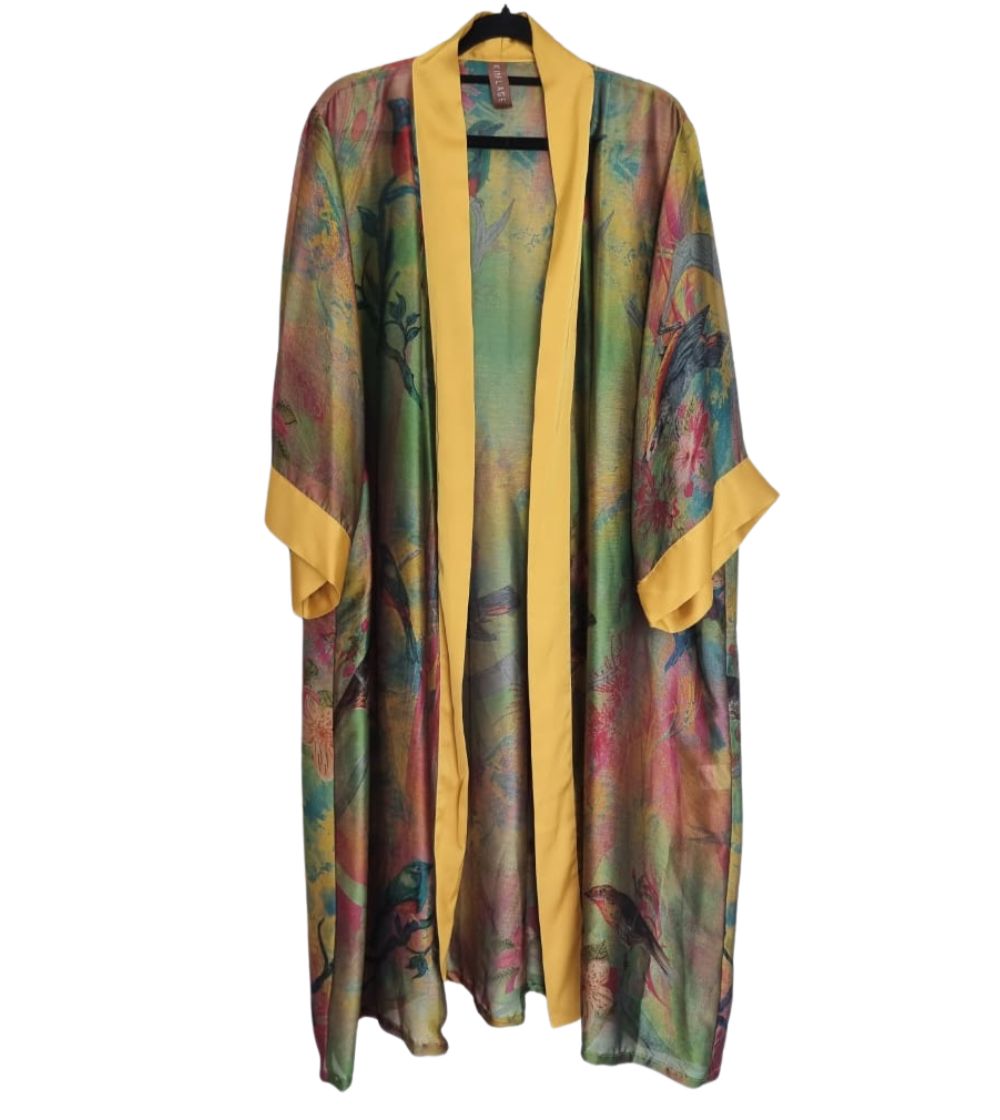 - Breezy, elegant, and full of quiet joy, this kimono brings a touch of nature’s poetry to your every day. Combine it with just about any color from gold, green, yellow, orange, bronze, black, pearly white tones
