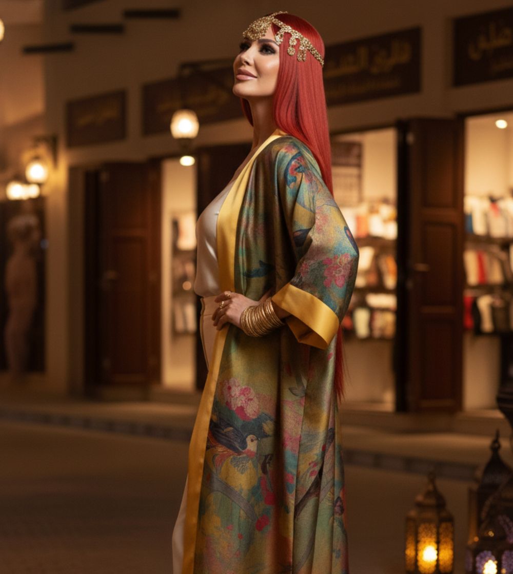 - This startling elegant piece drapes you in a soft watercolor dream of greens, golds, and whispering florals, with a sunshine-yellow trim, it evokes the freshness of a morning forest touched by mist.