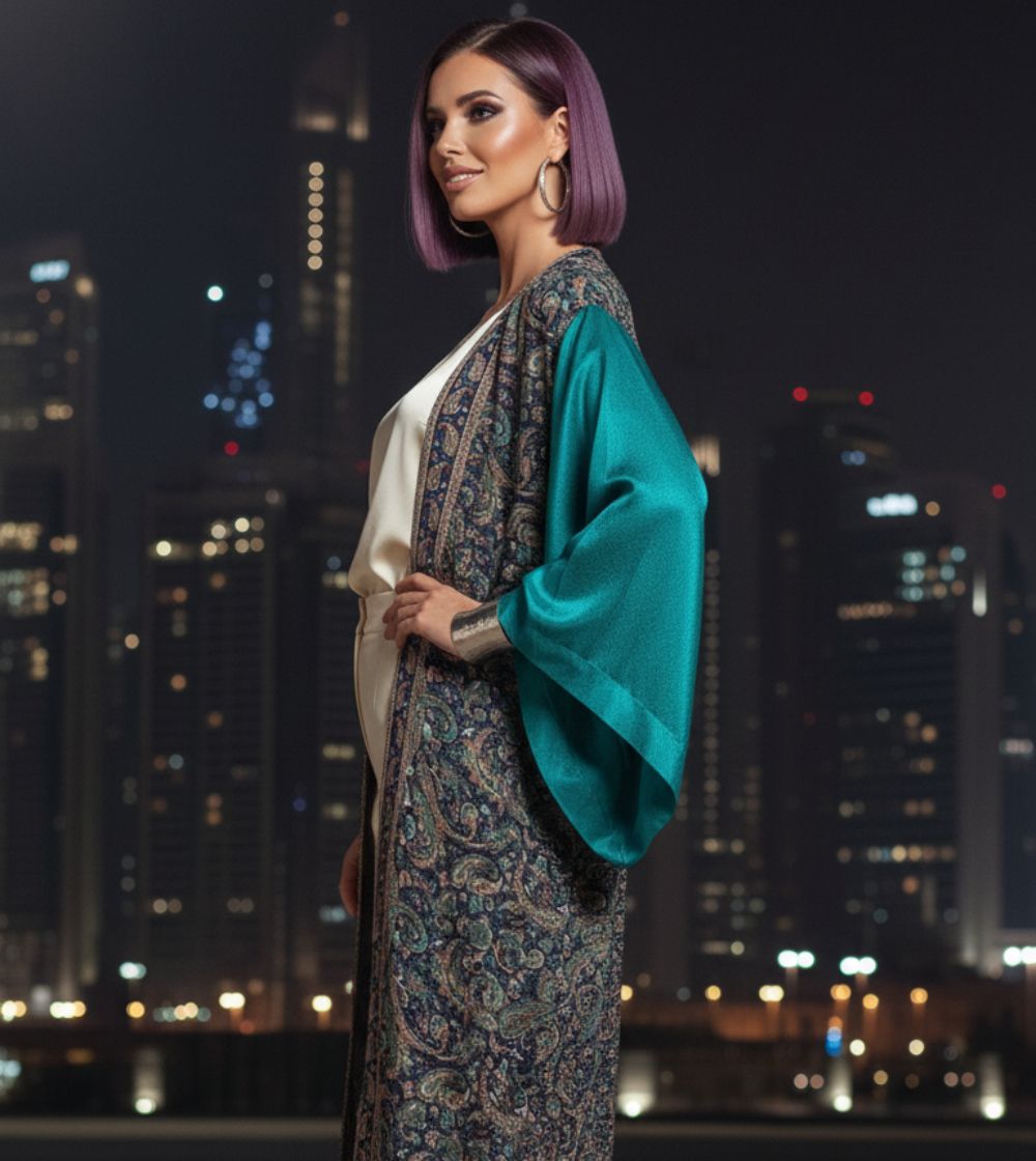 • Vintage charm with bohemian flair. Its intricate paisley print in earthy tones is elevated by striking turquoise sleeves, adding a refreshing pop of color and elegance.