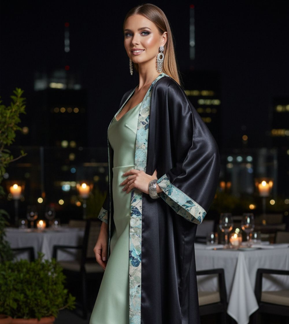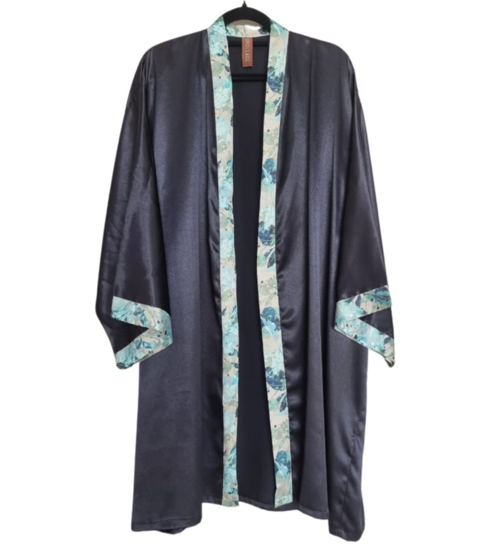 - Crafted in deep charcoal satin with soft teal and ivory printed borders, this kimono is the perfect blend of edge and elegance.